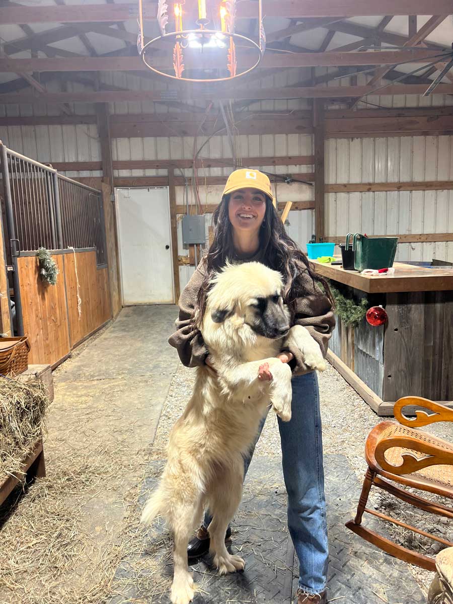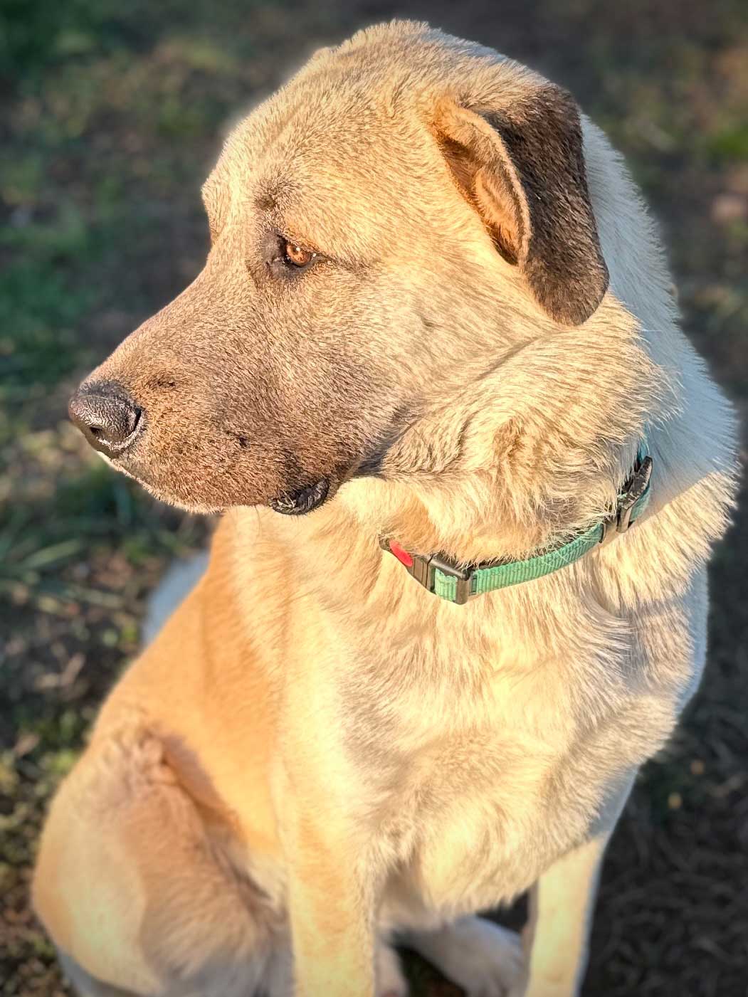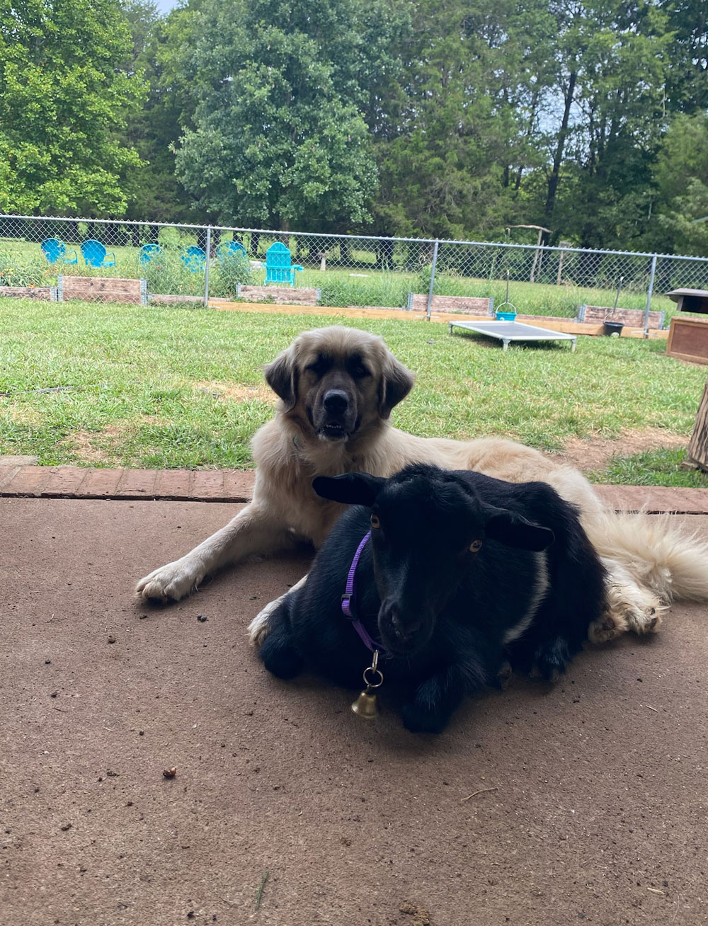 Momma Lyric is 50% Anatolian Shepherd & 50% Great Pyrenees, one of four working Livestock Guardian dogs here on the farm. It is her job to help keep our herd of goats safe from coyotes & bobcats in our area. She has an unexpected side hustle as an interaction dog to a select few of our clients. She has an uncanny ability to choose who needs/wants her attention. She is all about the full body hug.