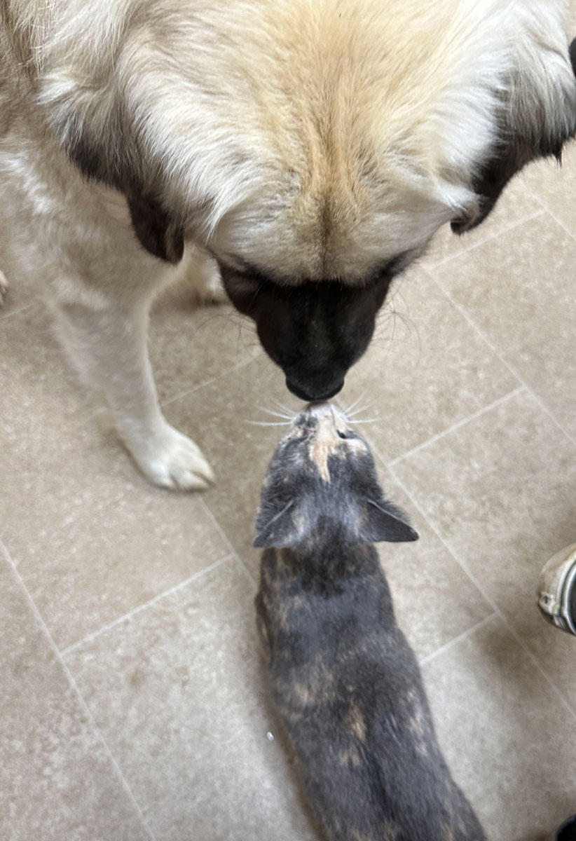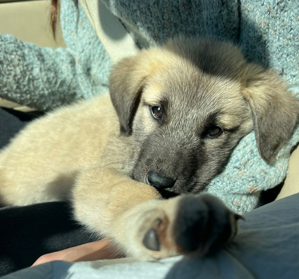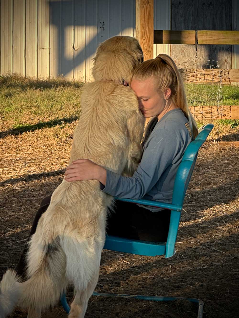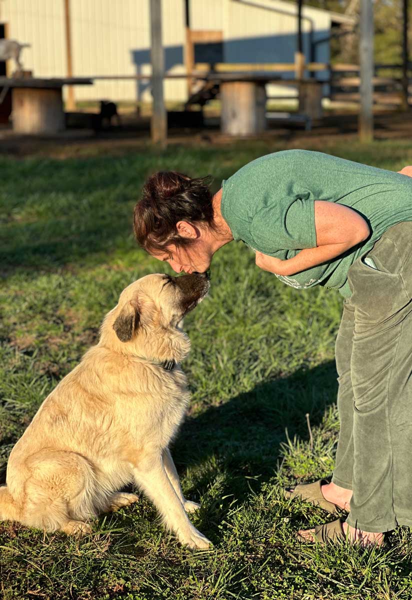 Momma Lyric is 50% Anatolian Shepherd & 50% Great Pyrenees, one of four working Livestock Guardian dogs here on the farm. It is her job to help keep our herd of goats safe from coyotes & bobcats in our area. She has an unexpected side hustle as an interaction dog to a select few of our clients. She has an uncanny ability to choose who needs/wants her attention. She is all about the full body hug.